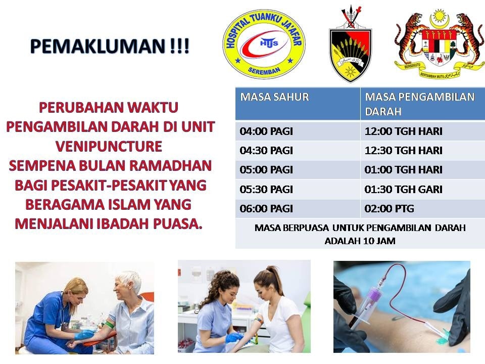 Unit Venepuncture HTJS akan menjalankan prosedur pengambilan darah mengikut masa seperti yang tertera di bawah sepanjang bulan Ramadan. Ketetapan masa ini diharap dapat menjadi rujukan buat semua pesakit beragama Islam yang perlu menjalani prosedur pengambilan darah sekaligus mengelak daripada berlaku sebarang risiko yang tidak diingini.